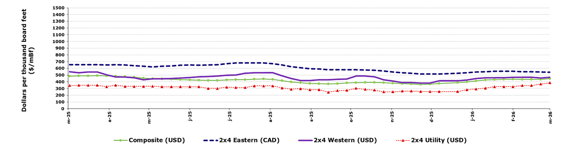 Dollars per thousand board feet | March 13, 2026 | March 6, 2026 | 4-week average | 52-weeks average |