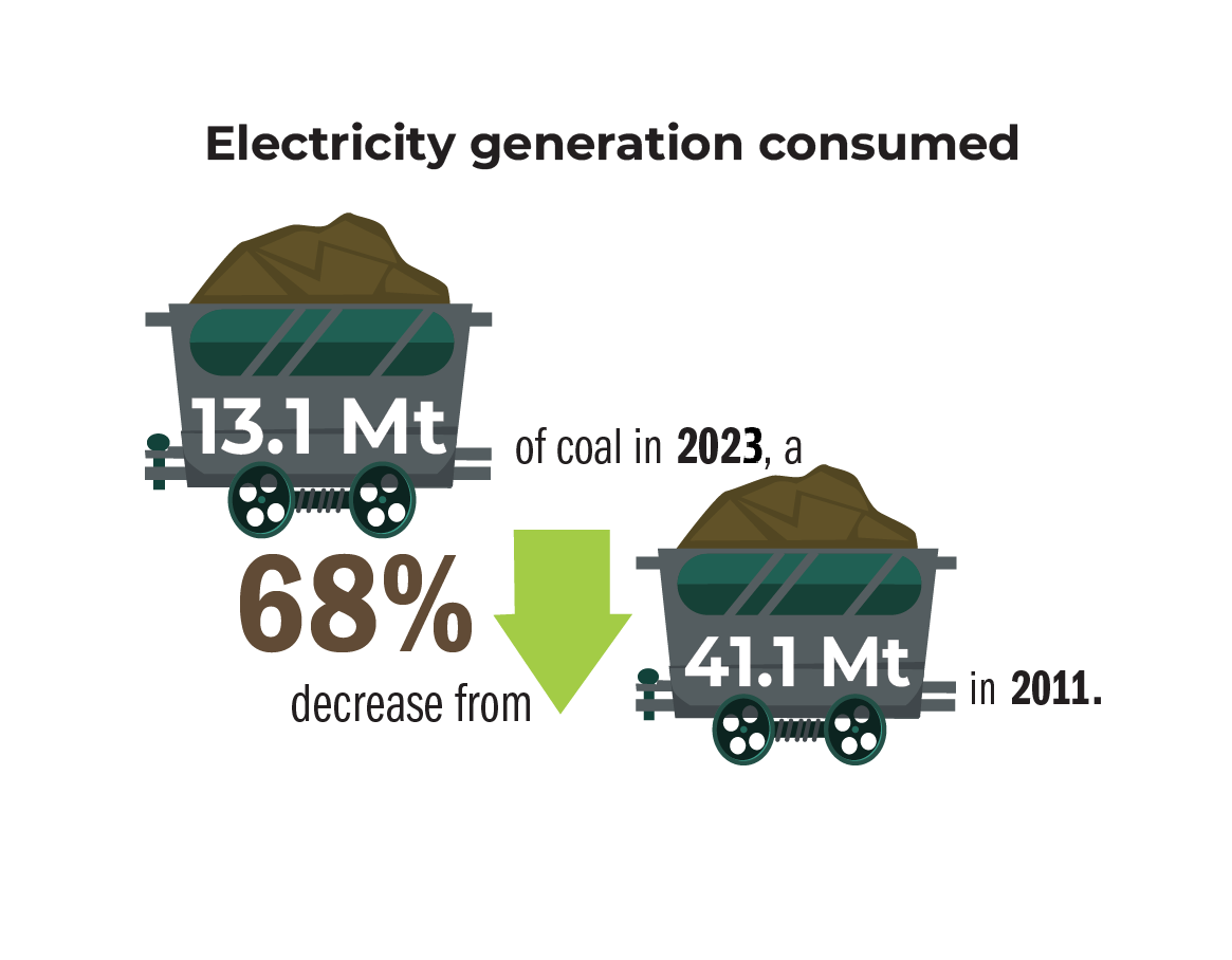 Coal supplies just over a third of global electricity generation. In Canada, 6% of the electricity was generated with coal in 2023, consuming 13.1 Mt of coal, which is down 68% from 41.1 Mt in 2011.