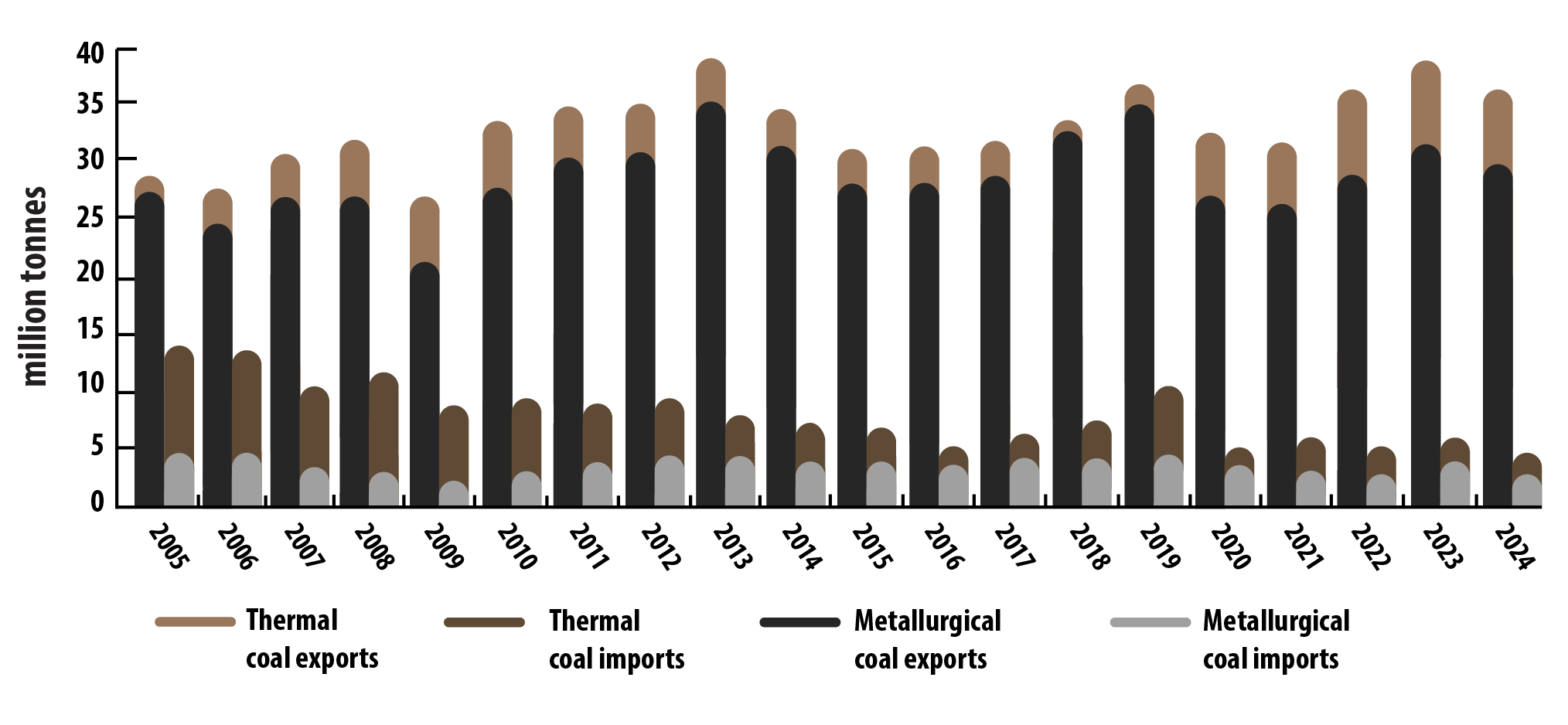 Metallurgical coal exports dropped from 27 million tonnes in 2005 to a low of 21 million tonnes in 2009, then rebounded to 35 million tonnes by 2013. After falling to 28 million tonnes in 2016, they rose to 35 million tonnes in 2019 before declining to 26 million tonnes in 2021. By 2024, exports recovered to 29 million tonnes.