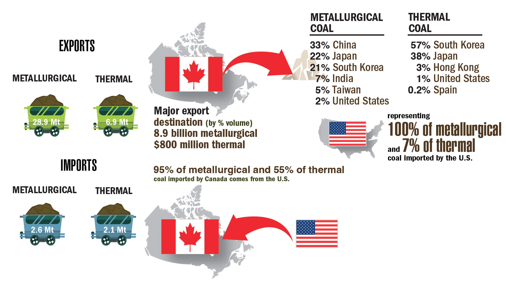 Canadian metallurgical and thermal coal imports, 95% and 55%, respectively, come from the United States. More than half of this imported coal is used for manufacturing steel, the rest is for generating electricity.