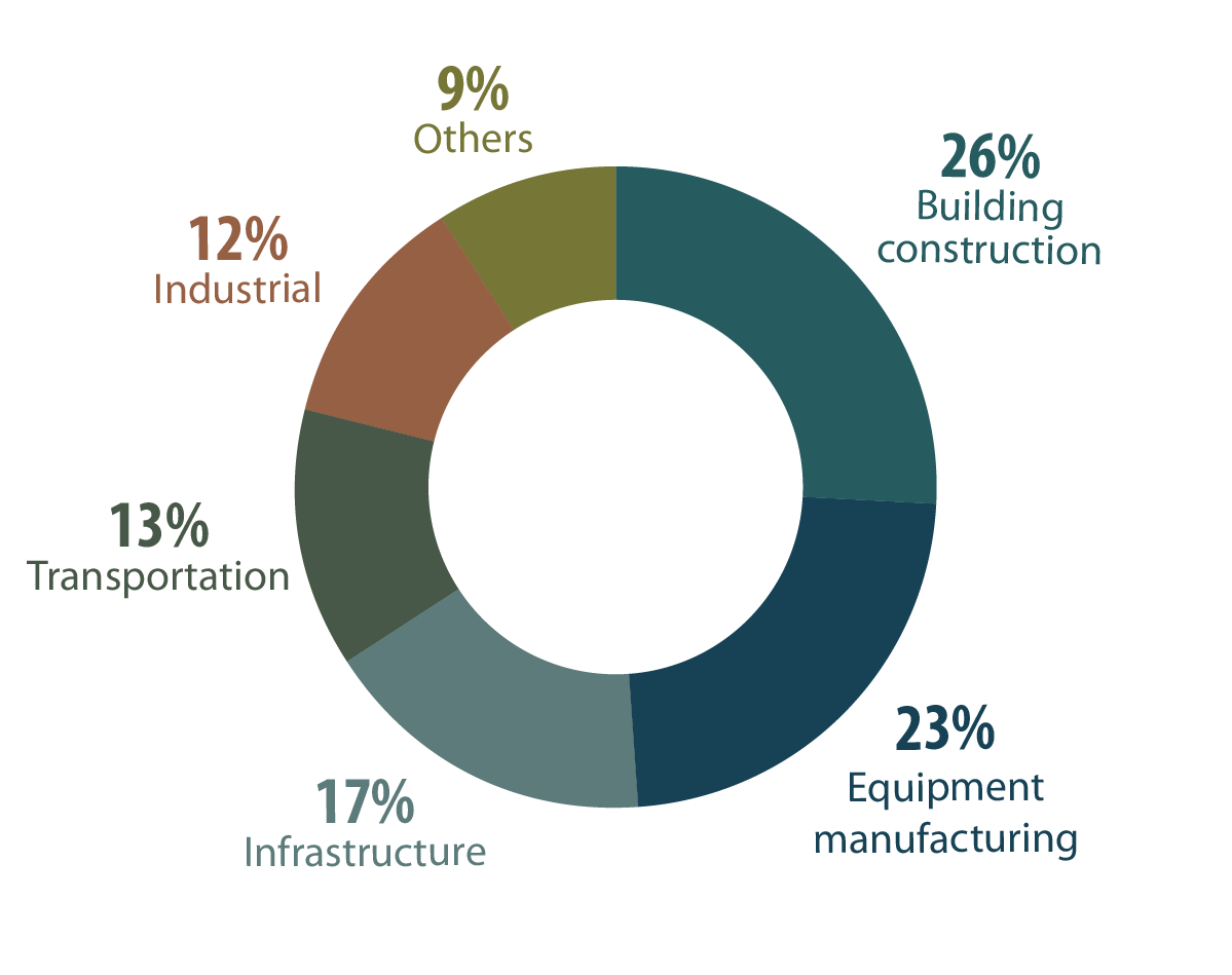 This pie chart illustrates the primary global uses of copper in 2024. The largest use was for building construction (26%), followed by consumer and general products, cooling, and electronic (23%), infrastructure (power and telecom) (17%), transportation (13%), industrial equipment (12%), and others (9%).