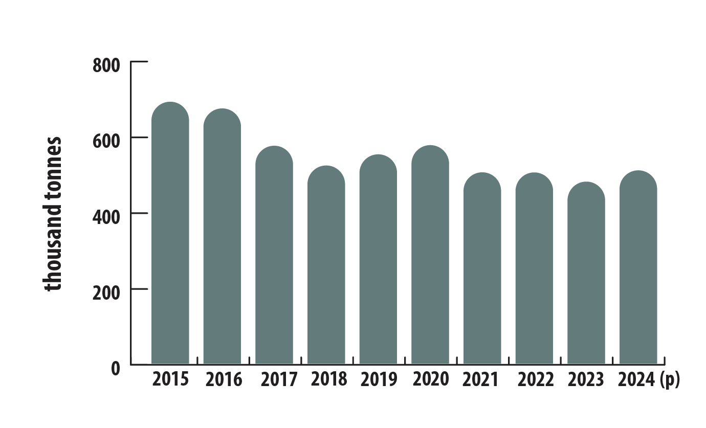 This bar graph illustrates Canada's annual mine production of copper from 2015 to 2024 (p). Production reached a 10-year peak of 697,322 tonnes in 2015 before gradually declining to 527,510 tonnes by 2018. It then climbed to 581,713 tonnes in 2020, but declined to 509,062 tonnes in 2022, with a further decrease to 484,552 tonnes in 2023. Production then increased to 514,582 tonnes in 2024.