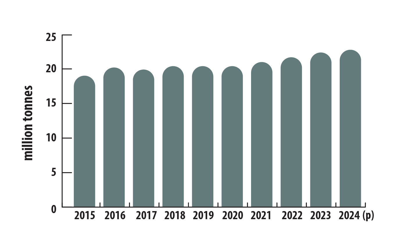 In 2024, Canadian mines produced 514,582 tonnes of copper in concentrate, marking an increase of 6.2% from the 484,552 tonnes produced in 2023. From 2015 to 2024, copper production in Canada declined 26.2%, falling from 697,322 tonnes to 514,582 tonnes.