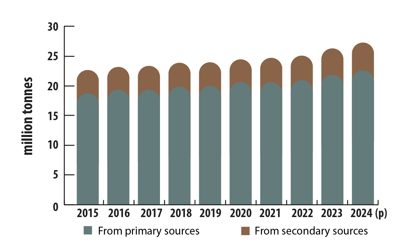 This bar graph illustrates the global production of refined copper from 2015 to 2024, including both primary and secondary sources. In 2015, refined copper production totaled 22.8 million tonnes, comprising 18.9 million tonnes from primary sources and 3.9 million tonnes from secondary sources. Over the decade, production increased steadily, reaching 27.5 million tonnes in 2024, with 22.8 million tonnes from primary sources and 4.7 million tonnes from secondary sources.
