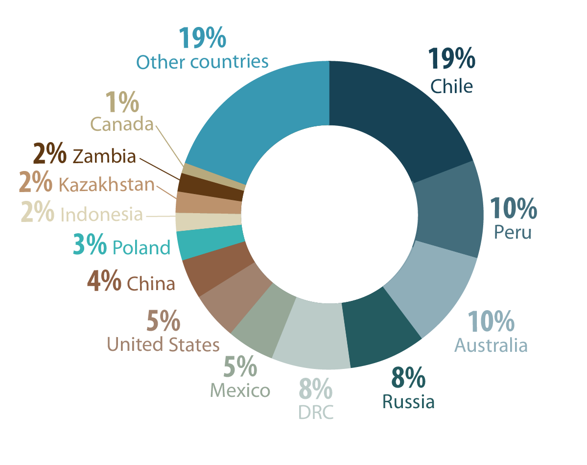 This circular chart illustrates the distribution of global copper reserves by country in 2024. Chile leads with 19% of the world’s reserves, followed by Peru and Australia with 10%, and Russia and Congo each hold 8%. Mexico and the United States each account for 5%, while China holds 4%. Poland has 3% and Indonesia, Kazakhstan, and Zambia each have 2% of the global reserves. Canada holds 1% of the world’s known copper reserves. All other countries collectively accounted for the remaining 19%.