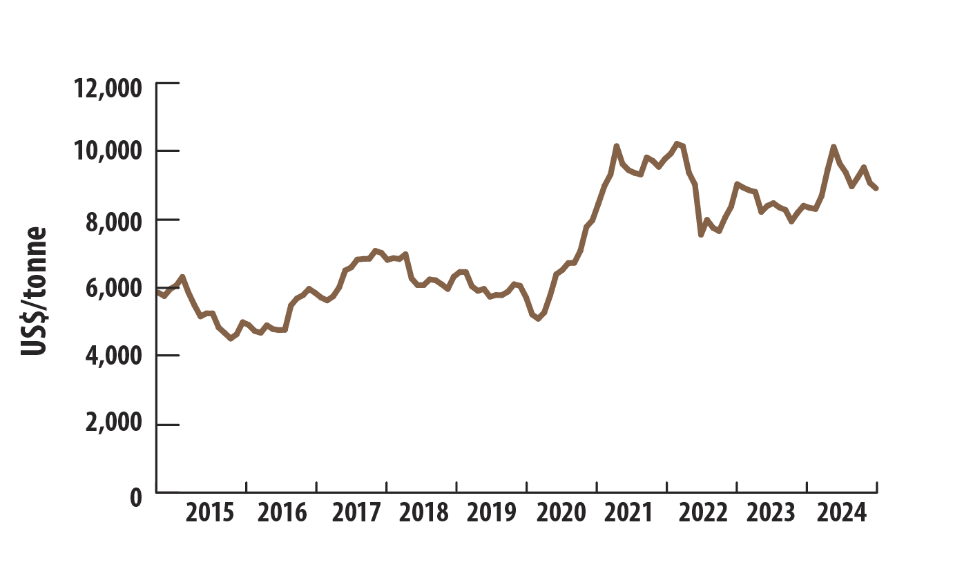 Copper price, monthly average, nominal United States dollars per tonne, 2015–2024