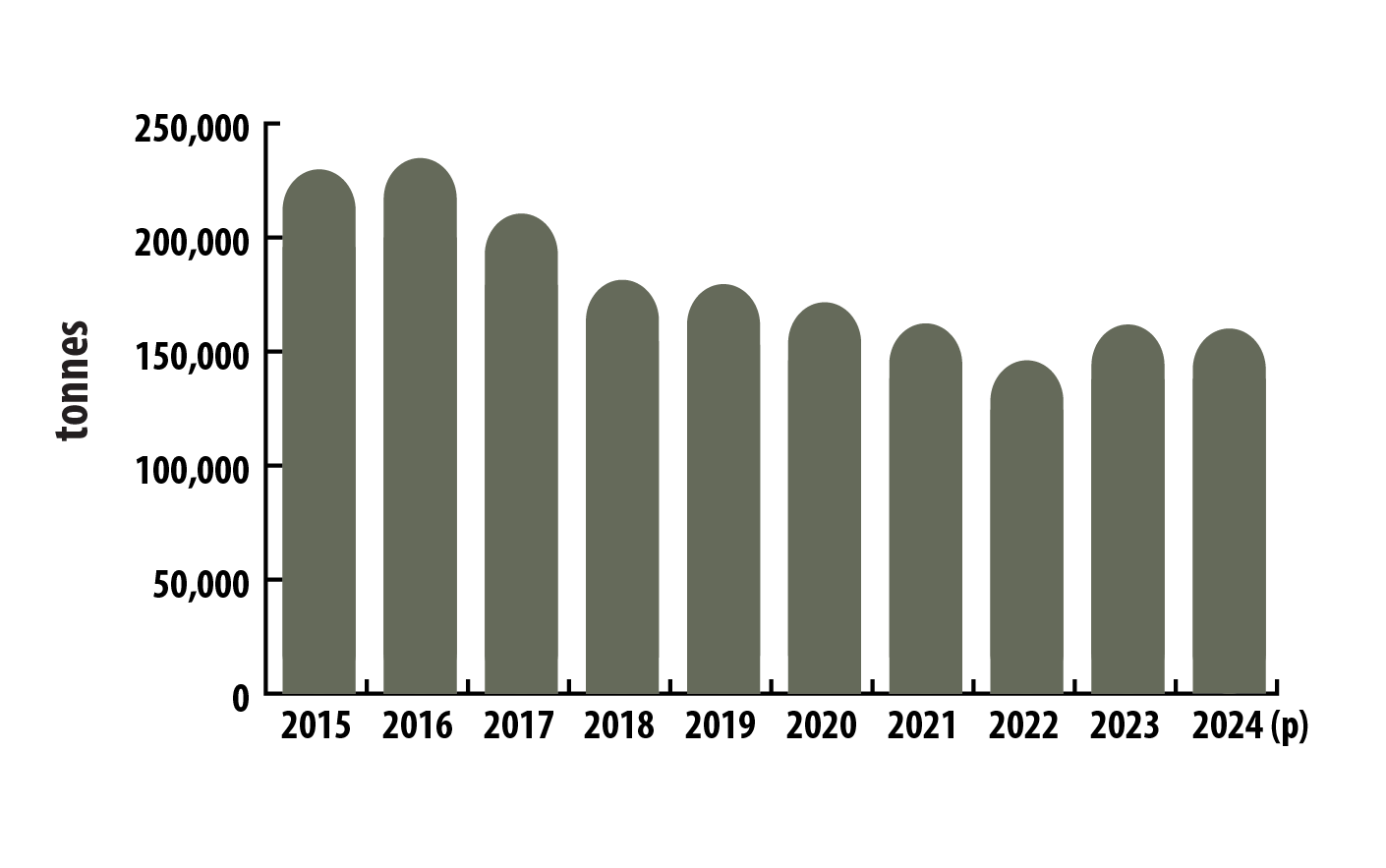 This bar graph illustrates Canada’s annual nickel mine production from 2015 to 2024. In 2015, production totaled 225,351 tonnes, rising to a 10-year high of 230,210 tonnes in 2016. Output then gradually declined, reaching a low of 122,115 tonnes in 2022. Since then, production has stabilized, fluctuating around 125,000 tonnes annually.