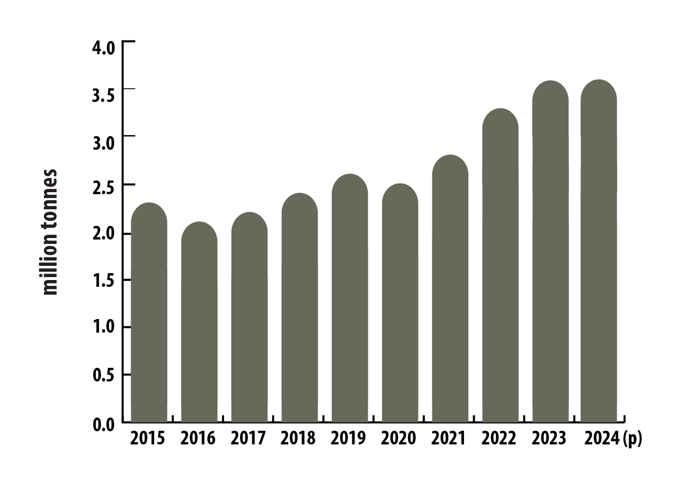 This bar graph depicts global nickel mine production from 2015 to 2024. Production declined from 2.3 million tonnes in 2015 to 2.1 million tonnes in 2016, before recovering to 2.6 million tonnes by 2019. After a slight drop to 2.5 million tonnes in 2020, output increased steadily, reaching 2.8 million tonnes in 2021, 3.3 million tonnes in 2022, and 3.6 million tonnes in 2023 and 2024.