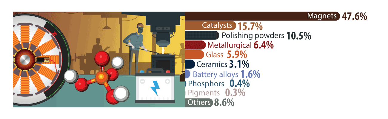 This chart illustrates global demand for REEs by market sector in 2024. The largest share is attributed to magnets (47.6%), followed by catalysts (15.7%), polishing powders (10.5%), metallurgical (6.4%), glass (5.9%), ceramics (3.1%), battery alloys (1.6%), phosphors (0.4%), and pigments (0.3%). Other uses accounted for the remaining 8.6%. In terms of specific REEs, neodymium had the highest demand (36%), followed by cerium (31%), lanthanum (18%), praseodymium (7%), and yttrium (3%), with the remaining REEs making up 5%.