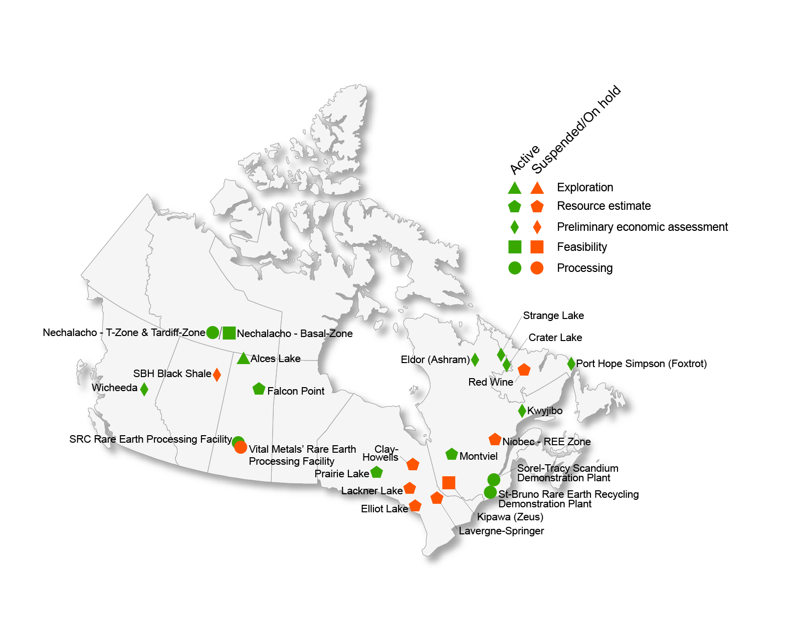 This map shows the location, status and stage of the largest Canadian REE projects.