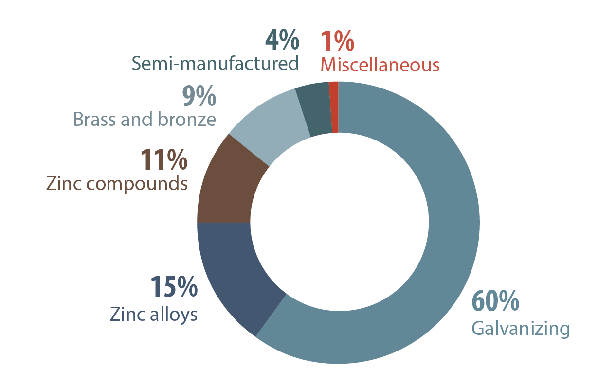 - The primary use of zinc is in the galvanizing process, which protects iron and steel from rusting.