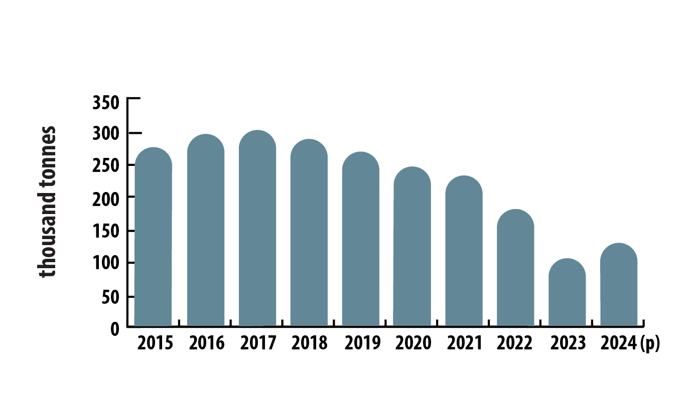 This bar graph shows Canada’s annual mine production of zinc from 2015 to 2024. Production was 275,410 tonnes in 2015 and increased slightly to 301,210 tonnes in 2016 and 305,314 tonnes in 2017. Output then declined steadily, reaching a decade low of 109,507 tonnes in 2023, before rising slightly to 129,202 tonnes in 2024.