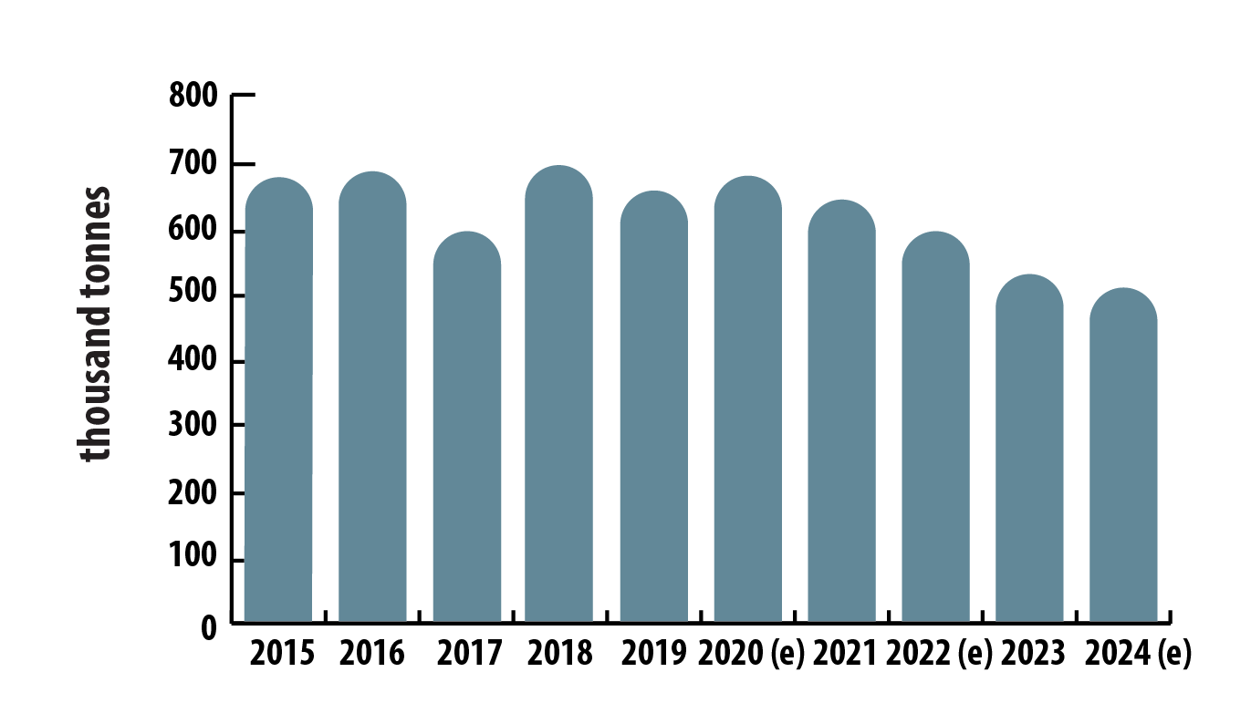 This bar graph shows Canada’s refined zinc production from 2015 to 2024. Production was 683,118 tonnes in 2015 and increased slightly to 691,389 tonnes in 2016. In 2017, production declined sharply to a decade low of 598,438 tonnes before rebounding to a decade high of 696,591 tonnes in 2018. Production then decreased to 654,971 tonnes in 2019 but rose to an estimated 680,245 tonnes in 2020. In the following years, production steadily declined to 640,718 tonnes in 2021, 599,900 tonnes in 2022, 531,600 tonnes in 2023, and 521,000 tonnes in 2024.