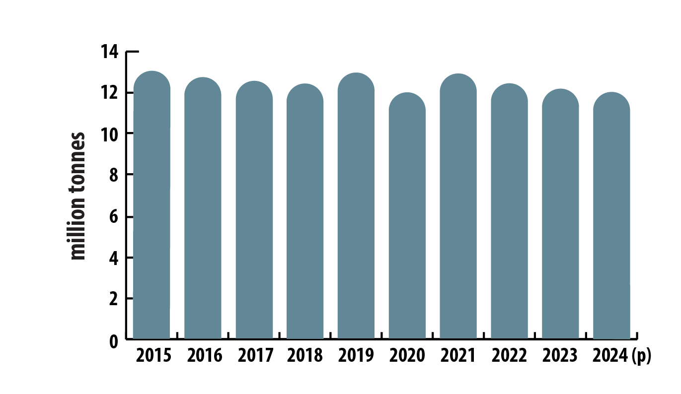 This bar graph shows the world’s annual mine production of zinc from 2015 to 2024. Production was 12.8 million tonnes in 2015 and decreased annually until it reached 12.5 million tonnes in 2018. Production increased slightly to 12.6 million tonnes in 2019, before decreasing to a decade low of 12.1 million tonnes in 2020. Production then rebounded to 13.0 million tonnes in 2022, before declining again to 12.1 million tonnes in 2023 and 12.0 million tonnes in 2024.