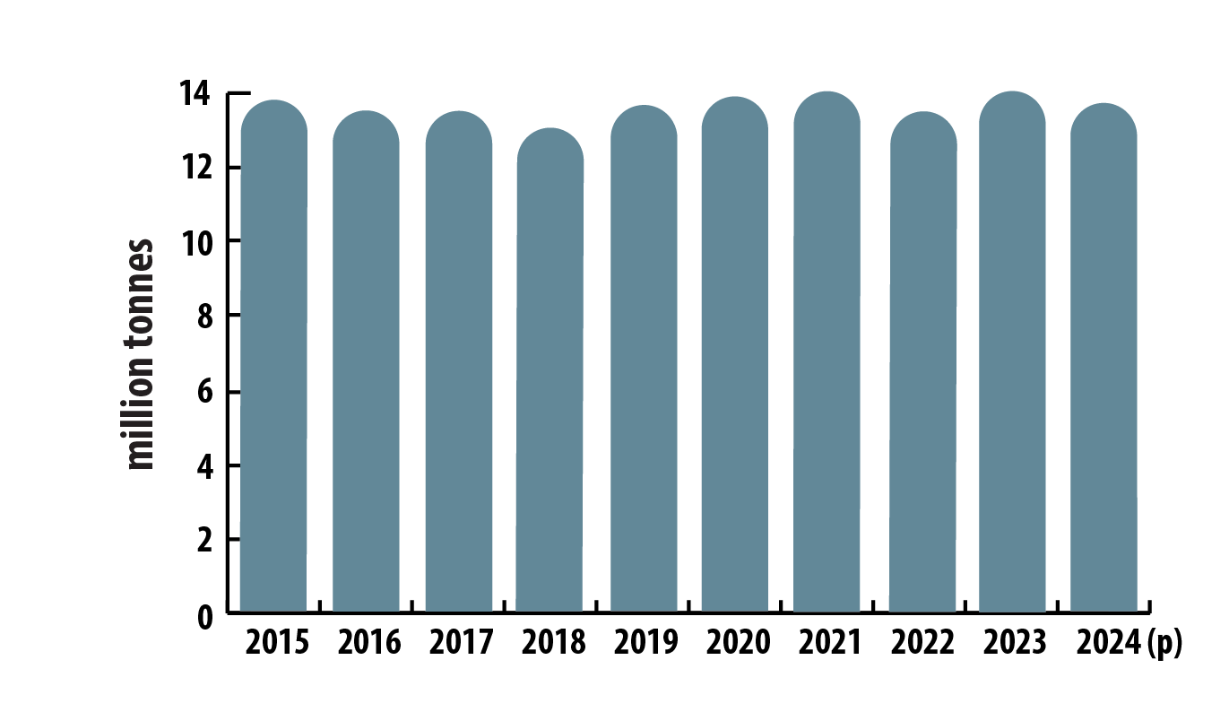 This bar graph shows the world’s annual production of refined zinc from 2015 to 2024. Production was 13.8 million tonnes in 2015 and declined each year between 2016 and 2018 to 13.1 million tonnes. It then rose to a decade high of 14.1 million tonnes in 2021. Production decreased to 13.5 million tonnes in 2022, rebounded to 13.9 million tonnes in 2023, and edged down again to 13.7 million tonnes in 2024.