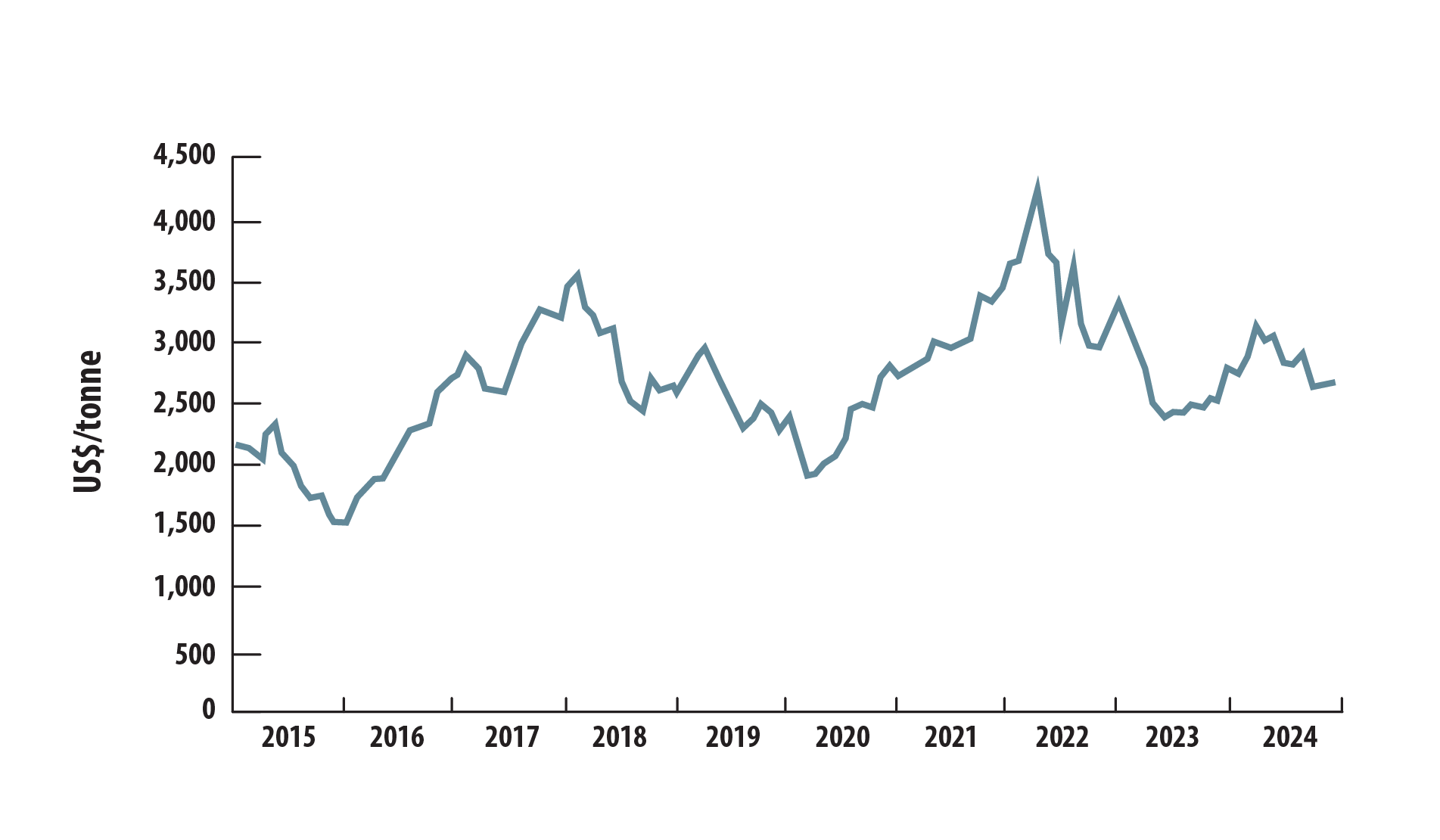 Prices subsequently declined to US$3,129 by December 2022 and to US$2,502 in December 2023. In 2024, prices climbed to a high of US$3,106 in April before falling to US$2,655 by December.