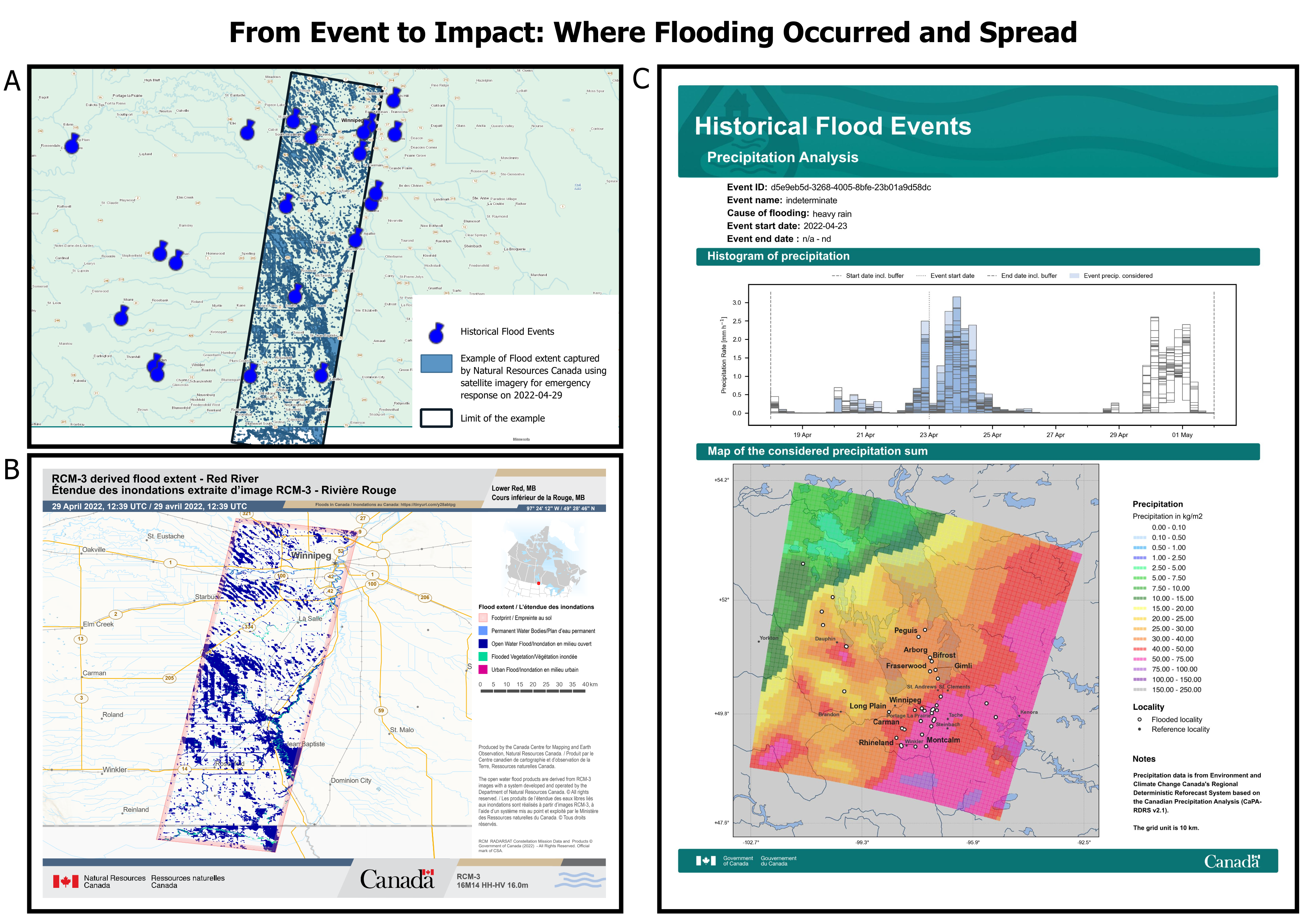 To improve data completeness, efforts have been made to ensure the inclusion of events mapped using satellite imagery for emergency management by Natural Resources Canada’s Emergency Geomatics Services (EGS) team. Each event in the HFE layer, along with the records of observed precipitation before and during the event, can be linked to the corresponding flooded areas identified by EGS. Together, these datasets offer a more comprehensive understanding of floods, from their meteorological causes to their impacts on the landscape. For example, the April 2022 flood in Manitoba affected 38 municipalities. By combining both datasets, analysis shows that the flood was caused by several days of heavy rainfall in the days leading up to the event.